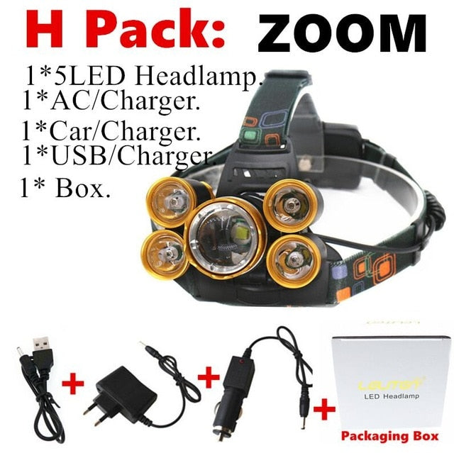 Dominate the darkness with the Extreme Bright 15000 Lumen LED Headlamp leliten 82, featuring a powerful central REE T6 LED supported by two auxiliary R5 bulbs for unparalleled illumination. Engineered for high-intensity activities like hunting, rock climbing, exploring, and fishing, this 30W torch provides essential wide-beam coverage 60° beam angle. Take full control with 3 essential switch modes: High, Middle, and Low. Select the Gold version for Zoom functionality (stretch lens) to easily adjust the focus, or the Black version for reliable, fixed-beam lighting. Built with high-efficiency circuitry and an adjustable base for precise aim, this headlamp is life waterproof and ready for any outdoor challenge (excluding diving). Power is supplied by 2x Rechargeable 18650 Lithium-ion batteries (sold separately), with multiple charging options including AC, Car, and USB charging. Secure your versatile, powerful lighting solution today and maximize your nighttime performance!