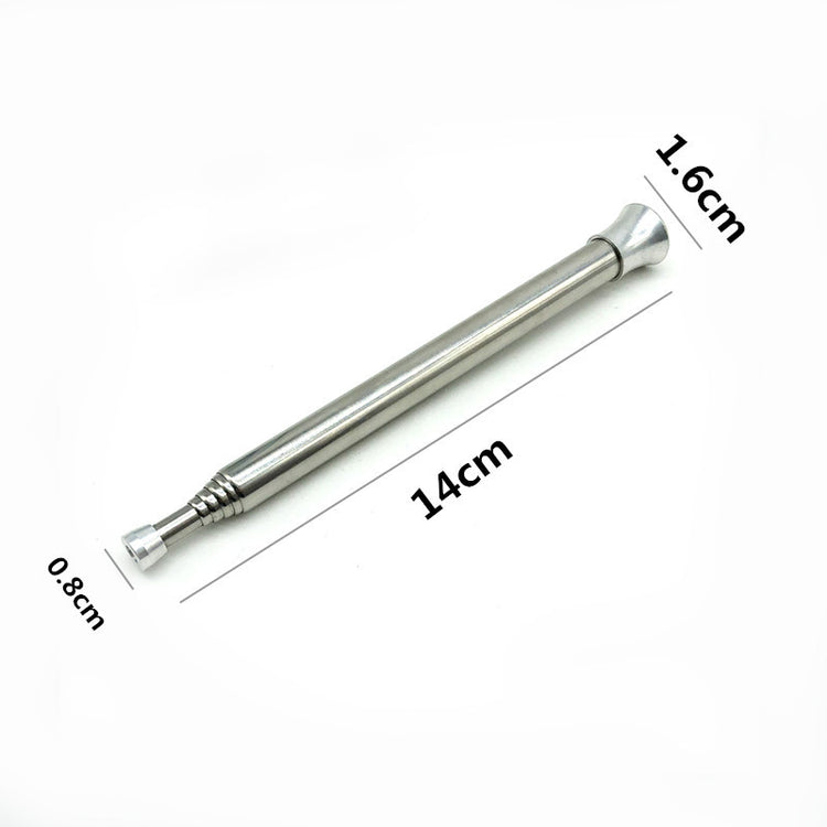 A telescopic fire tube, shown both collapsed and extended, made of stainless steel, highlighting its compact design and functionality for starting fires.