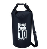 Brand: Ocean Pack (as indicated on the bag) Capacity: 10L Material: PVC mesh cloth Color: Black (as shown), Orange, Blue, White (other sizes may have different color options) Approximate Size (Filled): 42cm x 19cm x 19cm (based on search results for Ocean Pack 10L) Features: Waterproof, durable, foldable, lightweight, roll-top closure, buckle clasp hook. Suitable for: Boating, kayaking, camping, rafting, hiking, bicycle, and other outdoor activities.