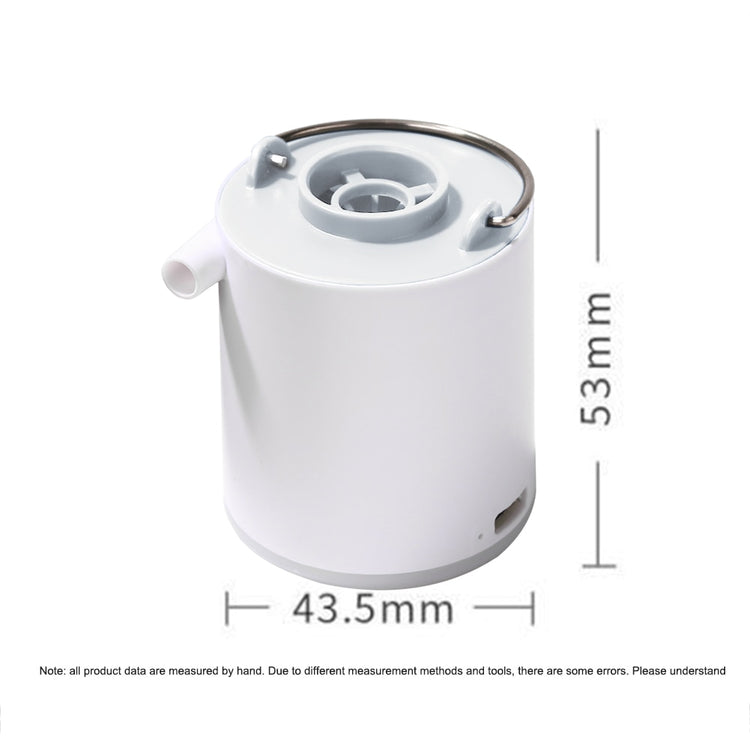 A small, white and gray cylindrical electric air pump with a nozzle and two buttons is shown. Dimensions are indicated as 43.5mm (width) and 53mm (height). Text notes that product data is measured by hand and may have errors.