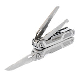 - Comprehensive Functionality: Includes long nose pliers, wire cutter, curved jaw pliers, hang hole, can opener, wire stripper, Phillips screwdriver, serrated blade, saw, hard-wire cutters, knife, file, slotted screwdrivers (M & L), reamer, and bottle opener.
