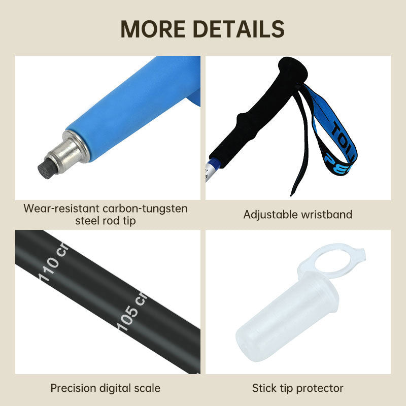 The three retractable EVA extension handles provide multiple comfortable grip options for varying terrains. The adjustable wrist straps are soft and easy to handle, ensuring a secure and comfortable fit throughout your trek. The anti-slip carbon tungsten steel tips offer excellent traction on various surfaces, providing stability and confidence with every step.