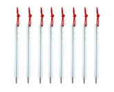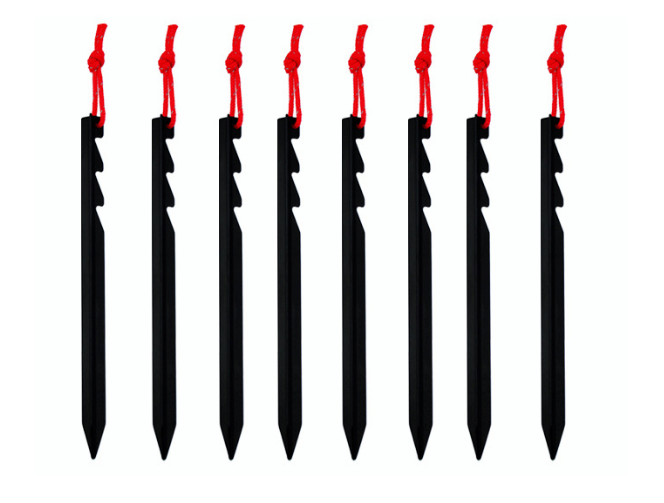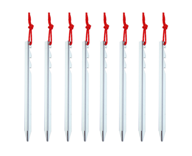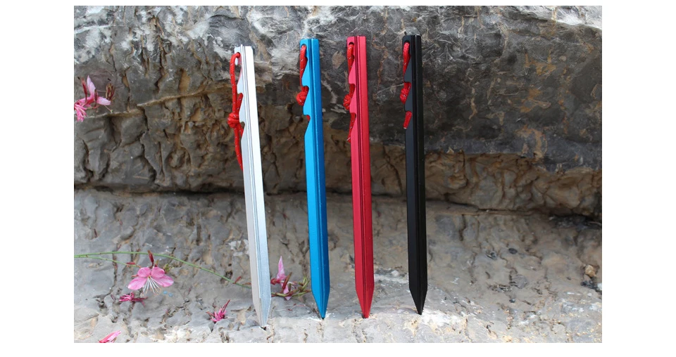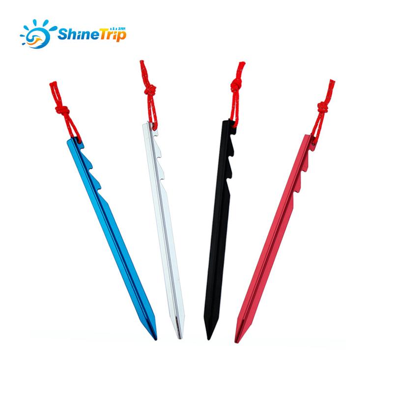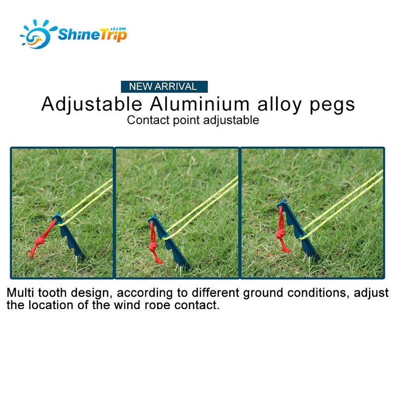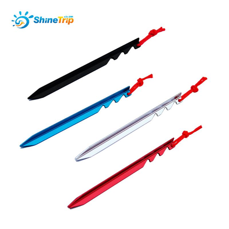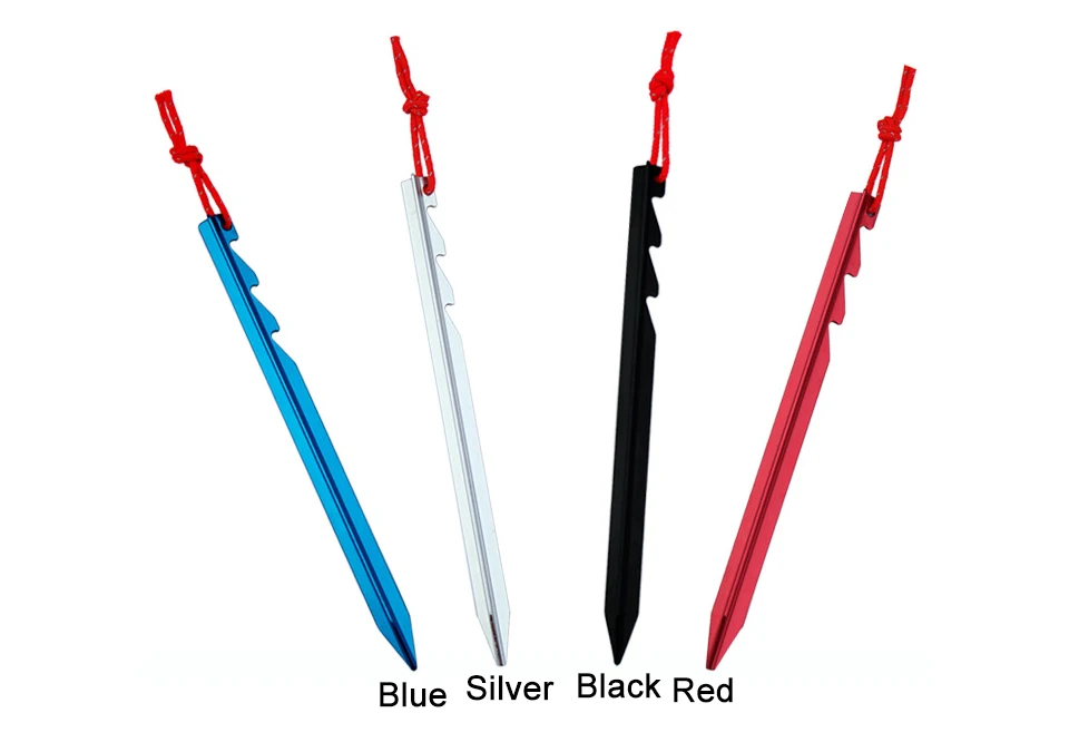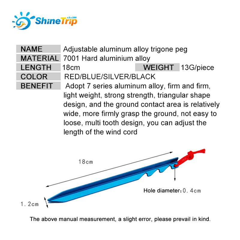 Brand: Shinetrip Quantity: 6 pieces/lot Material: Aluminum Alloy Design: Multi-tooth for strong grip Feature: Adjustable touch point, Super light Accessory: Red pull cord on each peg Ideal for: Camping, Backpacking