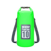 A bright green 10L waterproof dry bag with black straps and a black buckle closure. The words "WATER Proof bag" and the number "10" are printed in gray on the front.