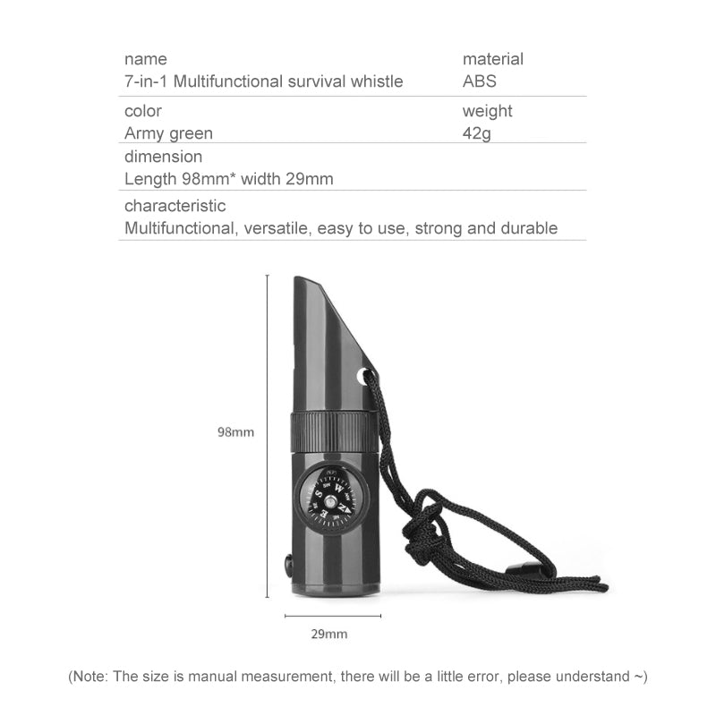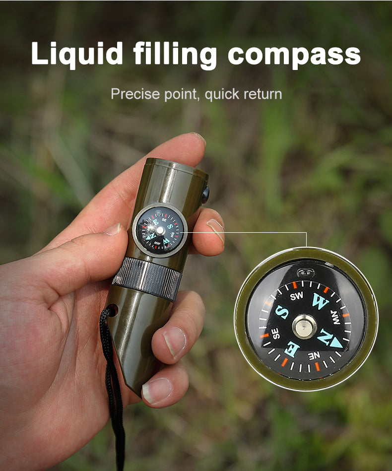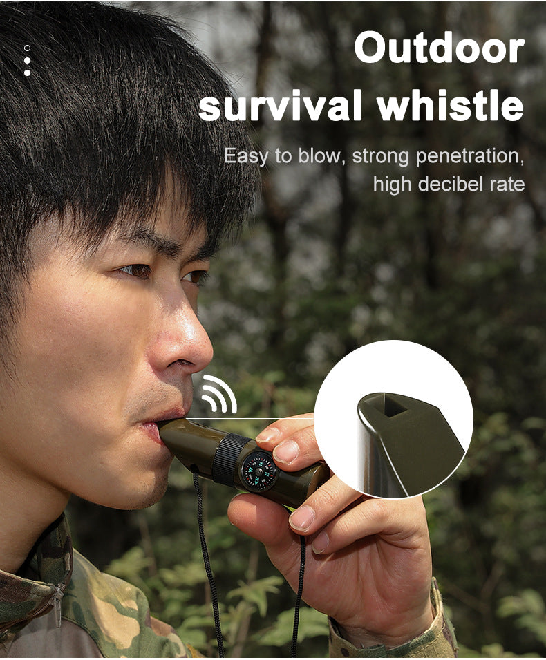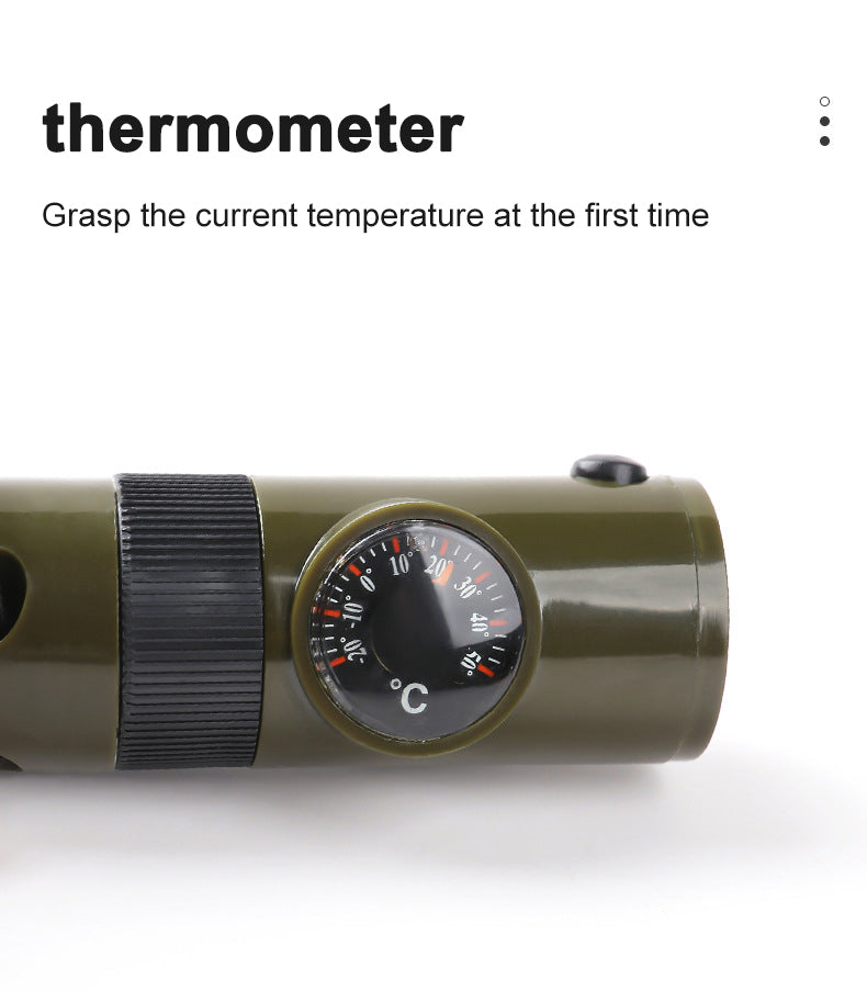 Perfect for hiking the trails, camping, backpacking, and ensuring you're prepared for any emergency, this 7-in-1 survival whistle provides you with the necessary tools to navigate, signal for help, stay informed, and handle basic needs in a compact and easy-to-carry design.