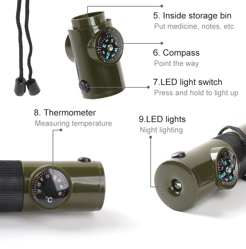 7-in-1 Functionality: Includes a loud emergency whistle, compass, thermometer, magnifying glass, reflector, LED light, and a small storage bin.