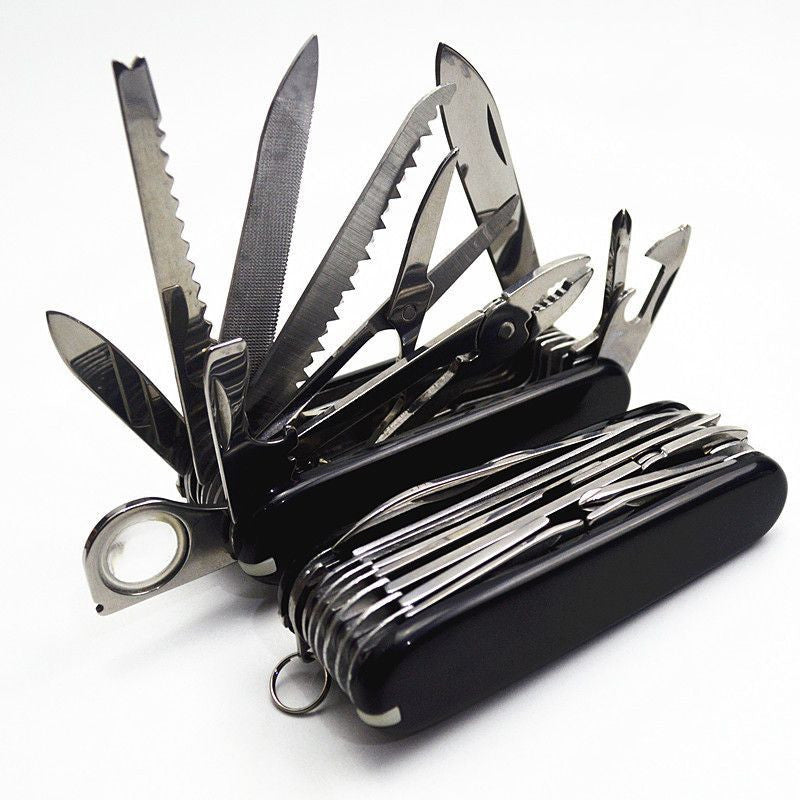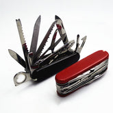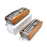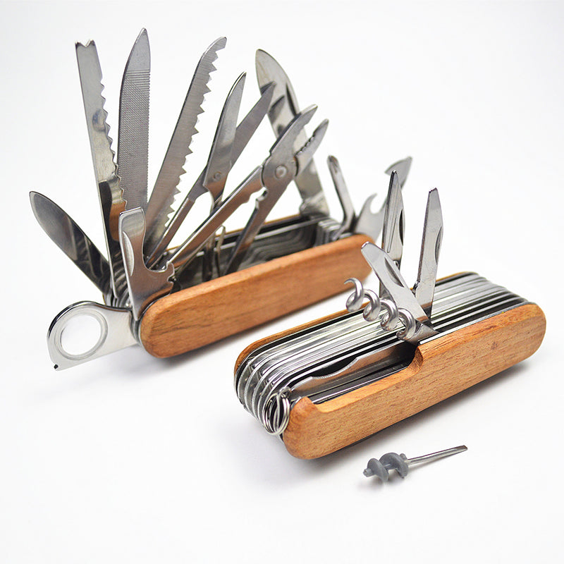 Material: Stainless Steel Handle Material: Wood Functions: Knife, Wood Saw, Hacksaw, Small Scissors, Bottle Opener, Can Opener, Red Wine Bottle Opener, Cross Screwdriver, Single-Sided File, Fish Scale Scraper, Screwdriver (multiple types), Threading Hole, Hanging Ring, Magnifying Glass, Small Pliers.
