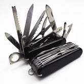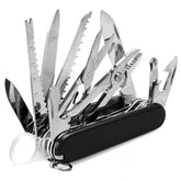 This comprehensive tool includes a knife, wood saw, hacksaw, small scissors, bottle opener, can opener, red wine bottle opener, cross screwdriver, single-sided file, fish scale scraper, various screwdrivers, a threading hole, a hanging ring, a magnifying glass, and small pliers. With this array of functions readily available, you'll be equipped to handle tasks ranging from preparing food at a campsite to making quick repairs on the trail. Its folding design ensures safe and easy storage in your pocket or backpack.