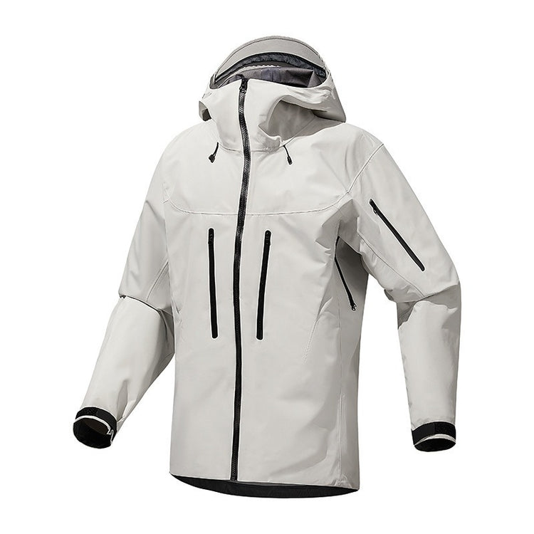 A light gray hard shell jacket with a hood, a front zipper, and vertical zippered pockets on the chest.